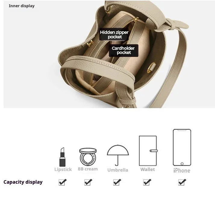 Weighing a mere 0.5kg (1.1lb) and measuring 20cm x 14cm x 19cm (7.87″ x 5.51″ x 7.48″), this soft bucket-shaped bag is ideal for casual outings or elevating your everyday look. Available in stunning shades of creamy white, yellow, and taupe, it complements any ensemble effortlessly.