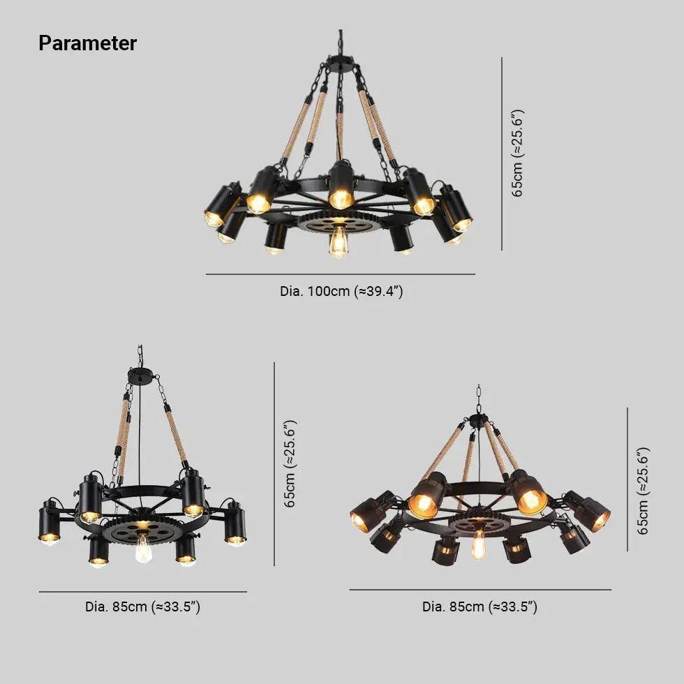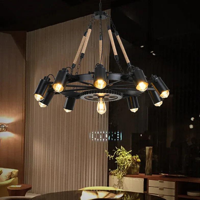 Illuminate your space with the stunning Black Wheel-Shaped Multi-Bulb Industrial Pendant Light Fixture. This exquisite lighting solution combines functionality with a striking design that is perfect for cafes, bars, and living rooms, seamlessly enhancing any indoor ambiance. Crafted from high-quality metal and rope, this fixture showcases a unique wheel shape adorned with multiple bulbs, offering a vintage yet modern charm.