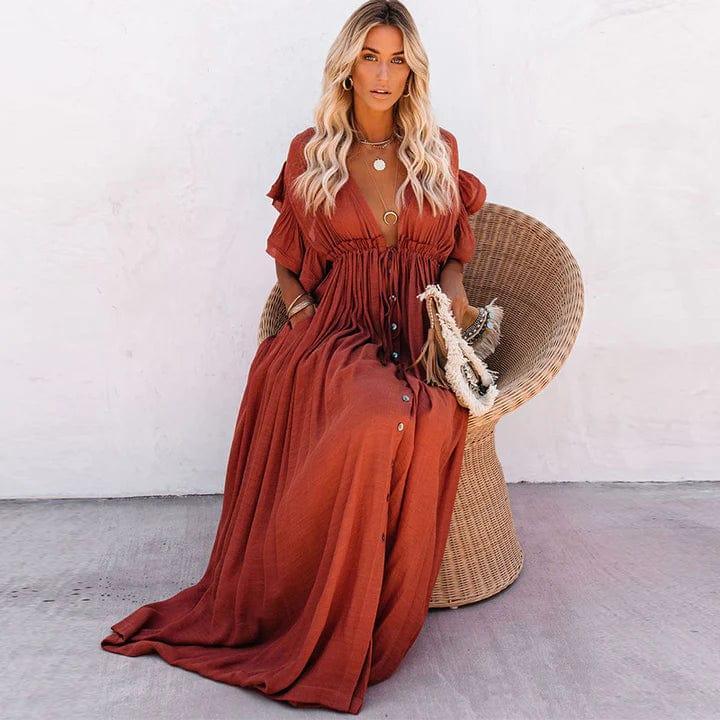 Effortlessly embody bohemian elegance with our Karina Women's Maxi Dress - Bohemian Style - Deep V-Neck - Short Ruffle Sleeves - Button Front. Designed for warm weather occasions, this flowing maxi dress combines comfort and style, ensuring you look fabulous while feeling at ease.