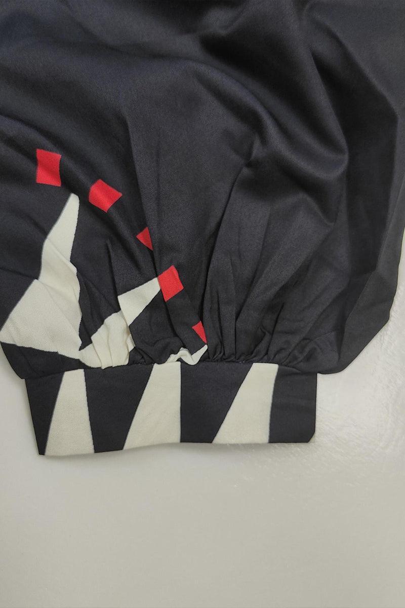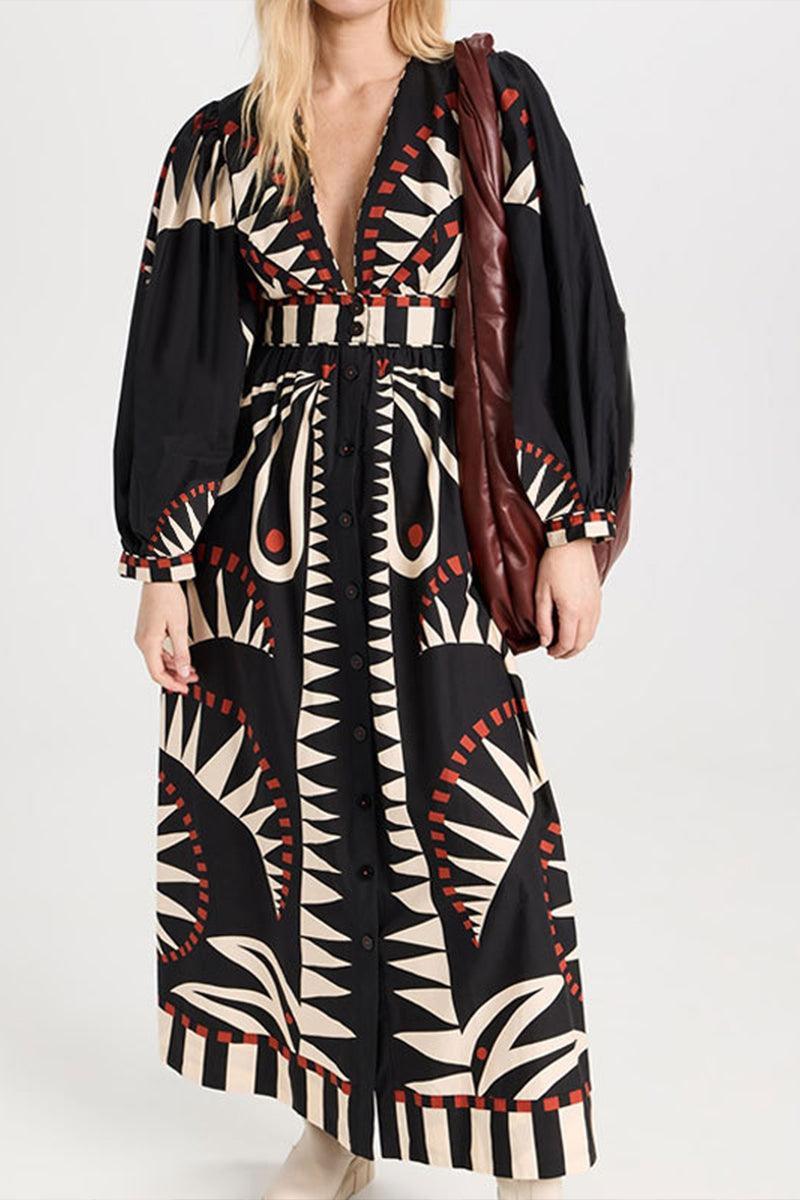 Make a bold statement with the Brittany Boho Geometric Maxi Dress, designed for the modern woman who values style and comfort. This striking piece showcases eye-catching geometric patterns, a deep V-neckline, and flowy balloon sleeves, making it perfect for both casual outings and special occasions.