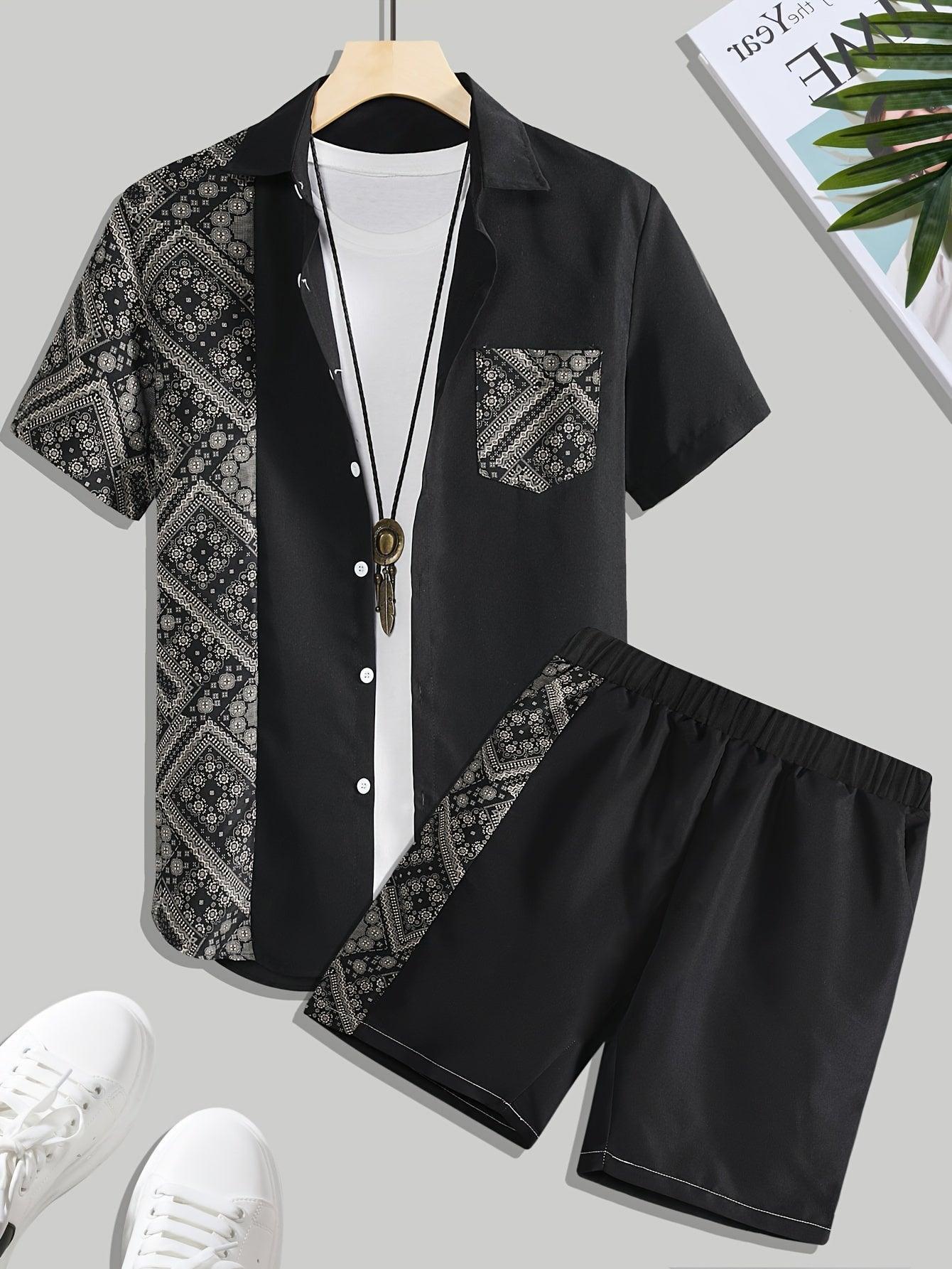 Elevate your summer wardrobe with the Ethnic print lapel shirt and short set for men. Perfect for outdoor adventures and casual outings, this stylish 2-piece ensemble combines comfort with eye-catching design, making it an ideal choice for warm weather days.