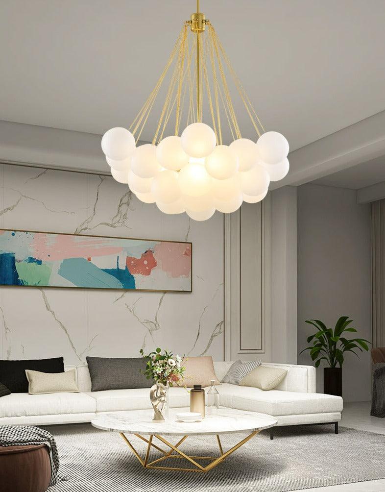 Transform your living space with the exquisite European Style White Flower Cluster Ball Glass Chandelier. This stunning chandelier captures the elegance of nature with its unique cloud-inspired design, featuring beautiful glass globes that mimic delicate flowers. Suspended by a robust premium iron frame, this chandelier is not just a lighting fixture—it's a statement piece that enhances the ambiance of any room.