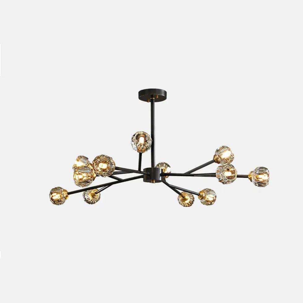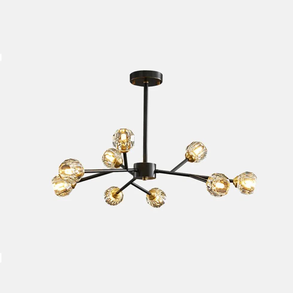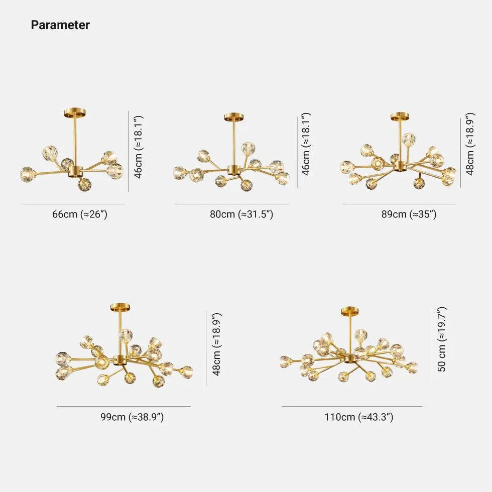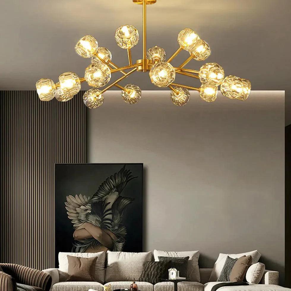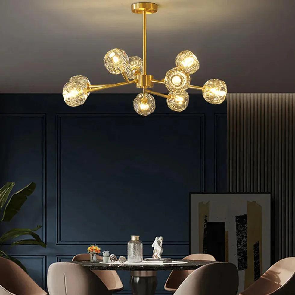 Crafted from pure copper and crystal, this chandelier showcases a beautiful radial design that captures light, reflecting it brilliantly across your room. The luxurious gold finish enhances its visual appeal, making it a statement piece that complements various interior styles.