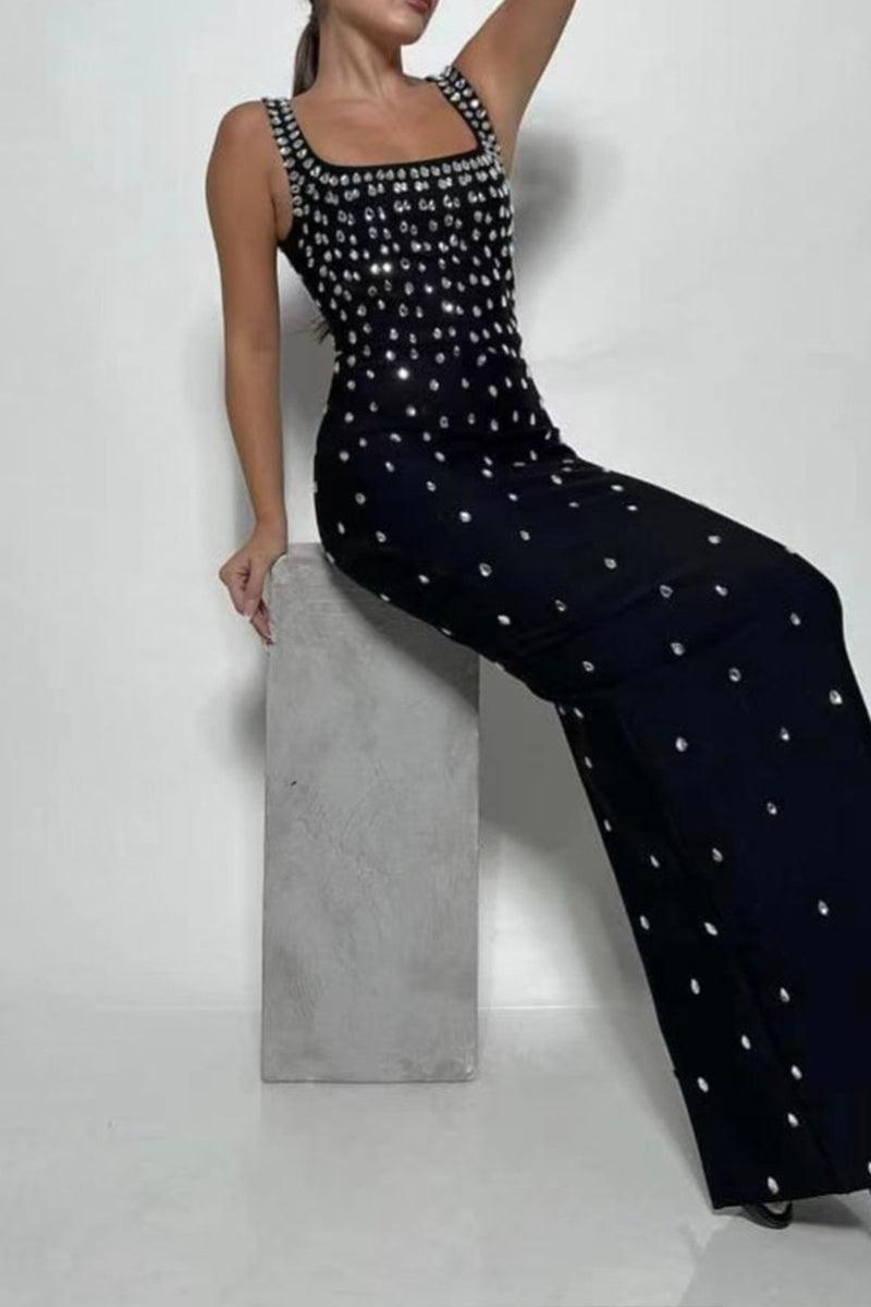 Elevate your evening attire with the stunning Imogen Maxi Dress. This sleek bodycon maxi dress features a chic square neckline and is adorned with exquisite gem embellishments that catch the light beautifully. The strategically placed side slit adds a touch of drama, making it perfect for special occasions where you want to turn heads.