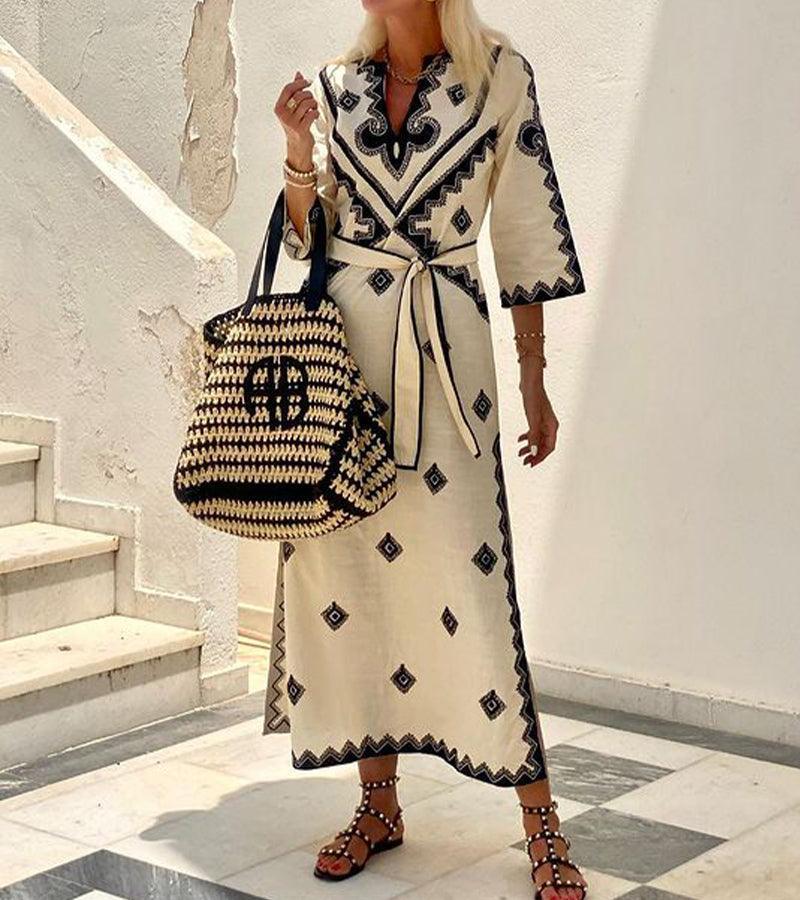 Elevate your wardrobe with our Kinslee Women's Kaftan Dress - V-Neck Embroidered - Three-Quarter Sleeve - Waist Tie Flowy Fit. This stunning kaftan is designed to offer a relaxed yet chic look, perfect for any casual occasion or beach outing. Its unique embroidery and flowy design make it an essential piece for effortless style.
