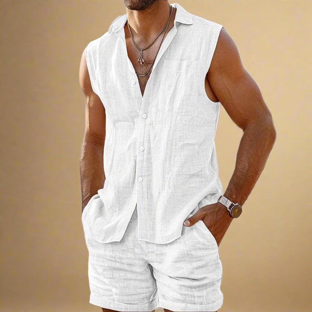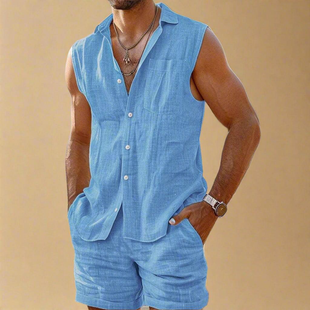 Upgrade your summer wardrobe with our Men’s Sleeveless Shirt crafted from a breathable cotton-linen blend. Designed for comfort and style, this relaxed fit button-up top is perfect for warm weather occasions. Its casual yet sophisticated look makes it a versatile addition to any man's wardrobe, ideal for beach days, outdoor gatherings, or casual outings.