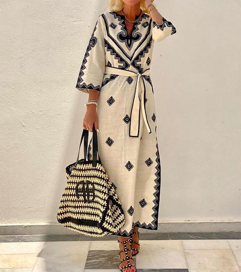 Elevate your wardrobe with our Skyla Women's Kaftan Dress - V-Neck Embroidered - Three-Quarter Sleeve - Waist Tie Flowy Fit. This stunning kaftan dress merges elegance with comfort, making it an ideal choice for casual outings or beach days. Its thoughtful design features create a flattering silhouette that enhances your natural beauty.